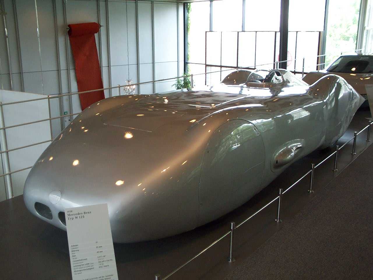 The car shown here was made in 1938. Rudolf Caracciola drove it on the Autobahn between Frankfurt and Darmstadt and reached 432.7 kilometers per hour, the highest speed ever reached on a public highway. Can you imagine you're moving along at whatever the usual speed was in 1938, and somebody comes up behind you at 432.7 kilometers per hour (268.9 miles per hour)?