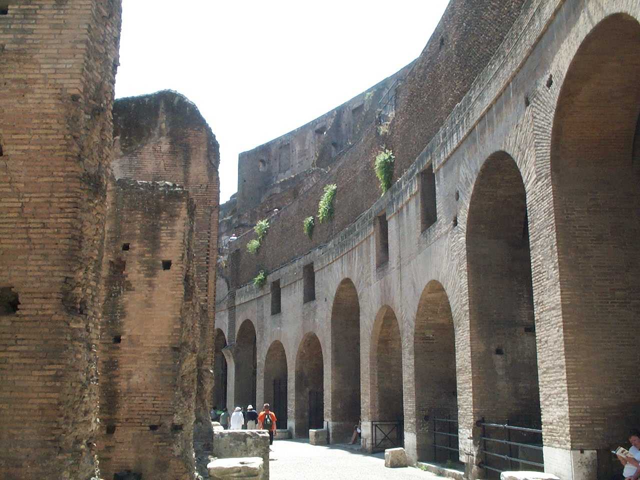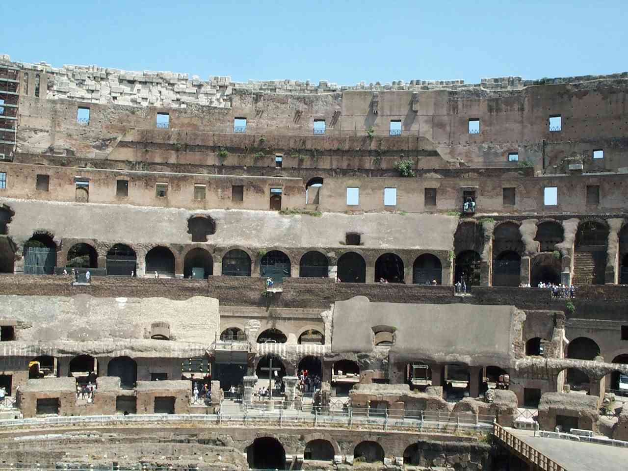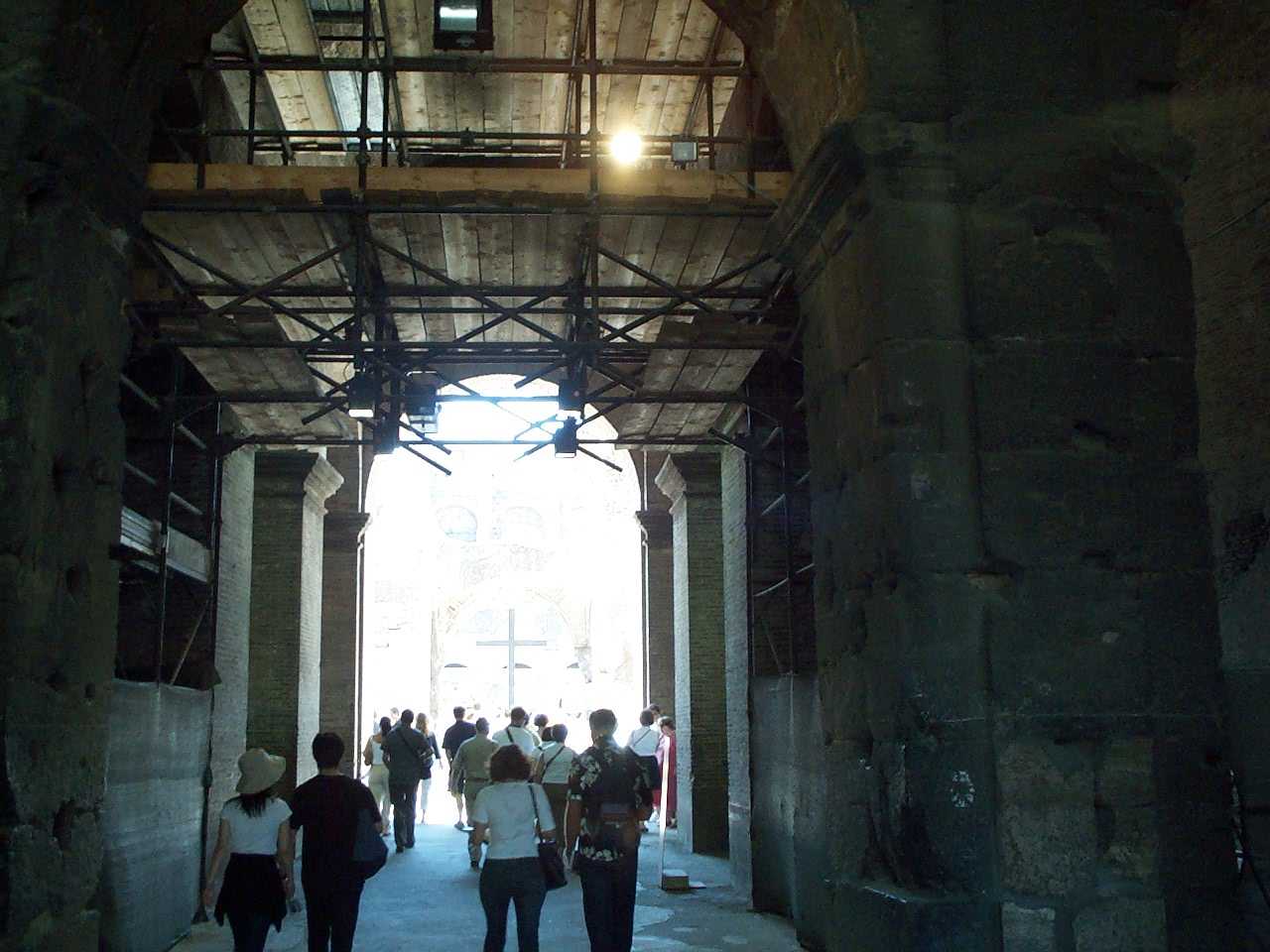 The right picture above is the emperor's entrance. There was a seat over the archway, but it is gone. In the large image, you can see a cross just beyond the arch. It was erected in memory of Christians killed in gladiatorial events. At the time, it may have been believed such events happened in the Flavian Amphitheater, but it is now believed such killings happened in other arenas but not the Flavian Amphitheater.
