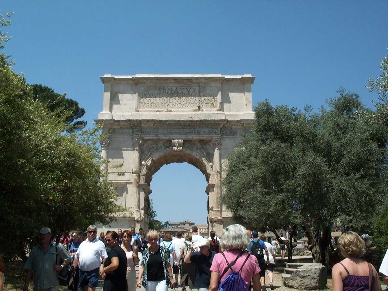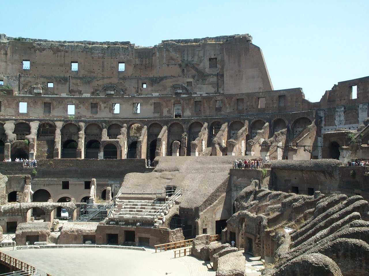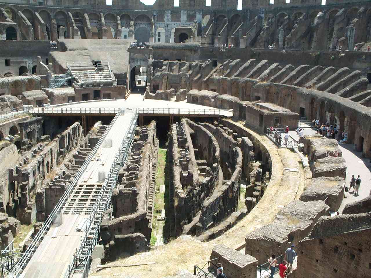 The right picture above is the emperor's entrance. There was a seat over the archway, but it is gone. In the large image, you can see a cross just beyond the arch. It was erected in memory of Christians killed in gladiatorial events. At the time, it may have been believed such events happened in the Flavian Amphitheater, but it is now believed such killings happened in other arenas but not the Flavian Amphitheater.