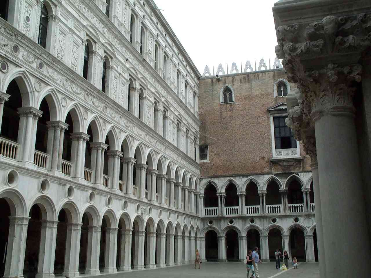 | Grande Canal. First views of Venezia, from Ponte degli Scalzi near the train station. | Train crossing causeway to Venezia. | Steps in Palazzo Ducale. Doges were crowned here. | |
