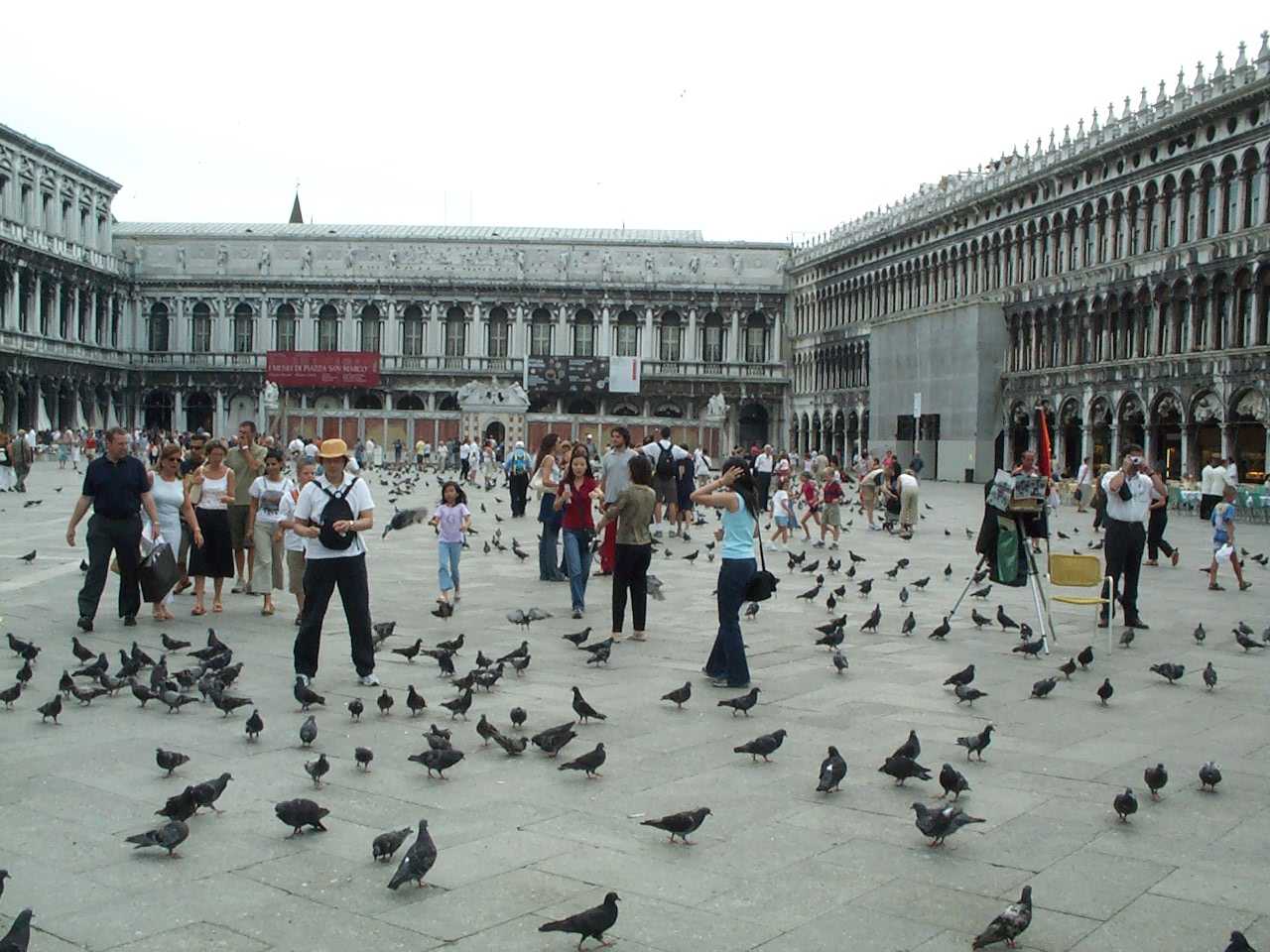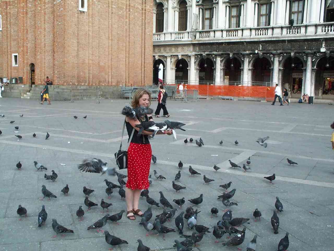 Vendors in the Piazza sell food for the birds. When you buy a package and open it, pigeons flock to you, as seen above.
