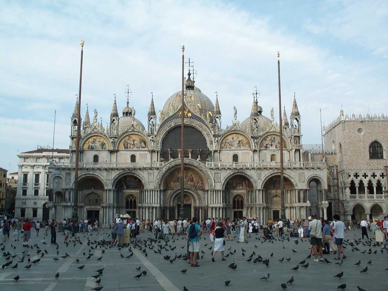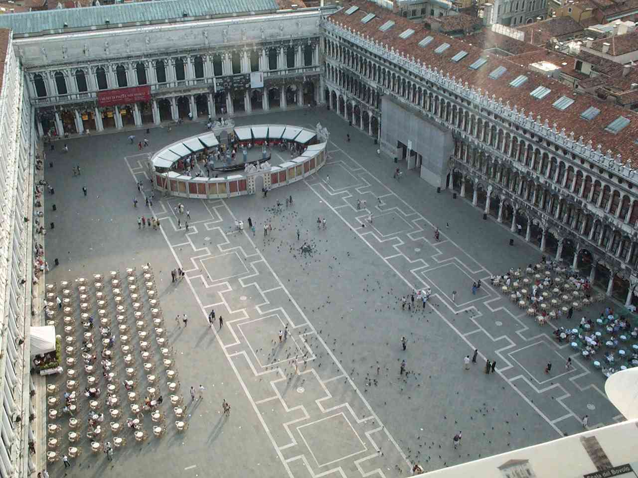 | Courtyard in Palazzo Ducale. | Glass aquarium in Pauly. | Piazza San Marco. | A busy calle (street). Streets can be narrow since they need not fit vehicles. |