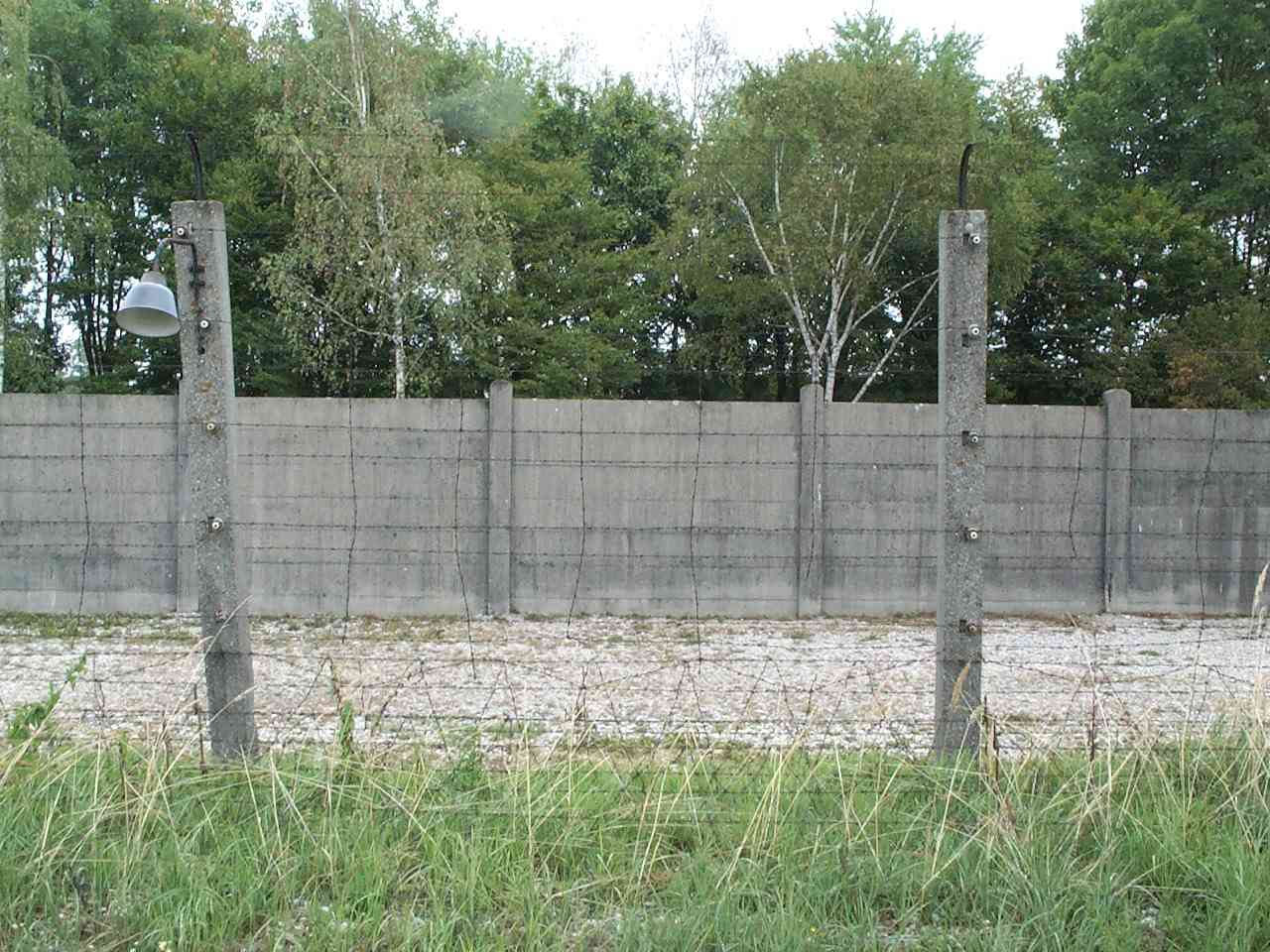 Fence. The fence was electrified. The barbed wire on the ground is a lot nastier than it appears in the picture. Dogs were in the corridor between the fence and the wall. |