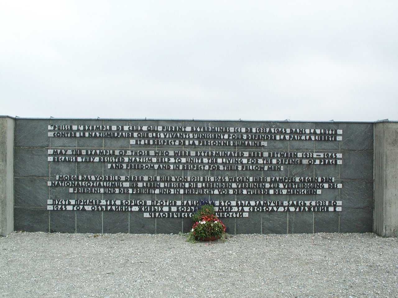 | Memorial wall. "May the example of those who were exterminated here between 1933-1945 because they resisted Nazism help to unite the living for the defence of peace and freedom and in respect for their fellow men." |