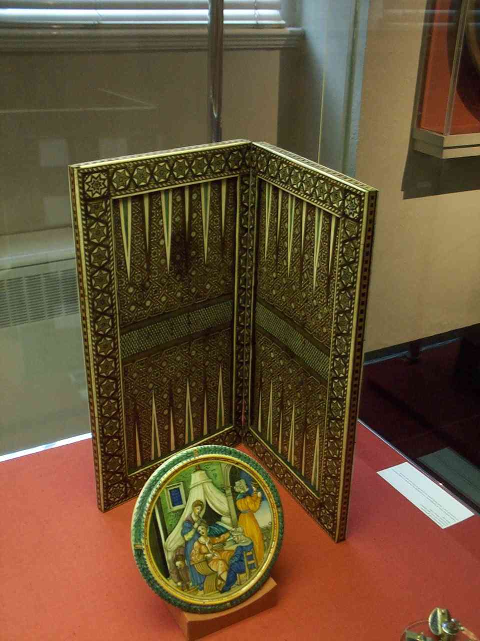 | Old chess board with computer. | Backgammon board on reverse of chess board. |