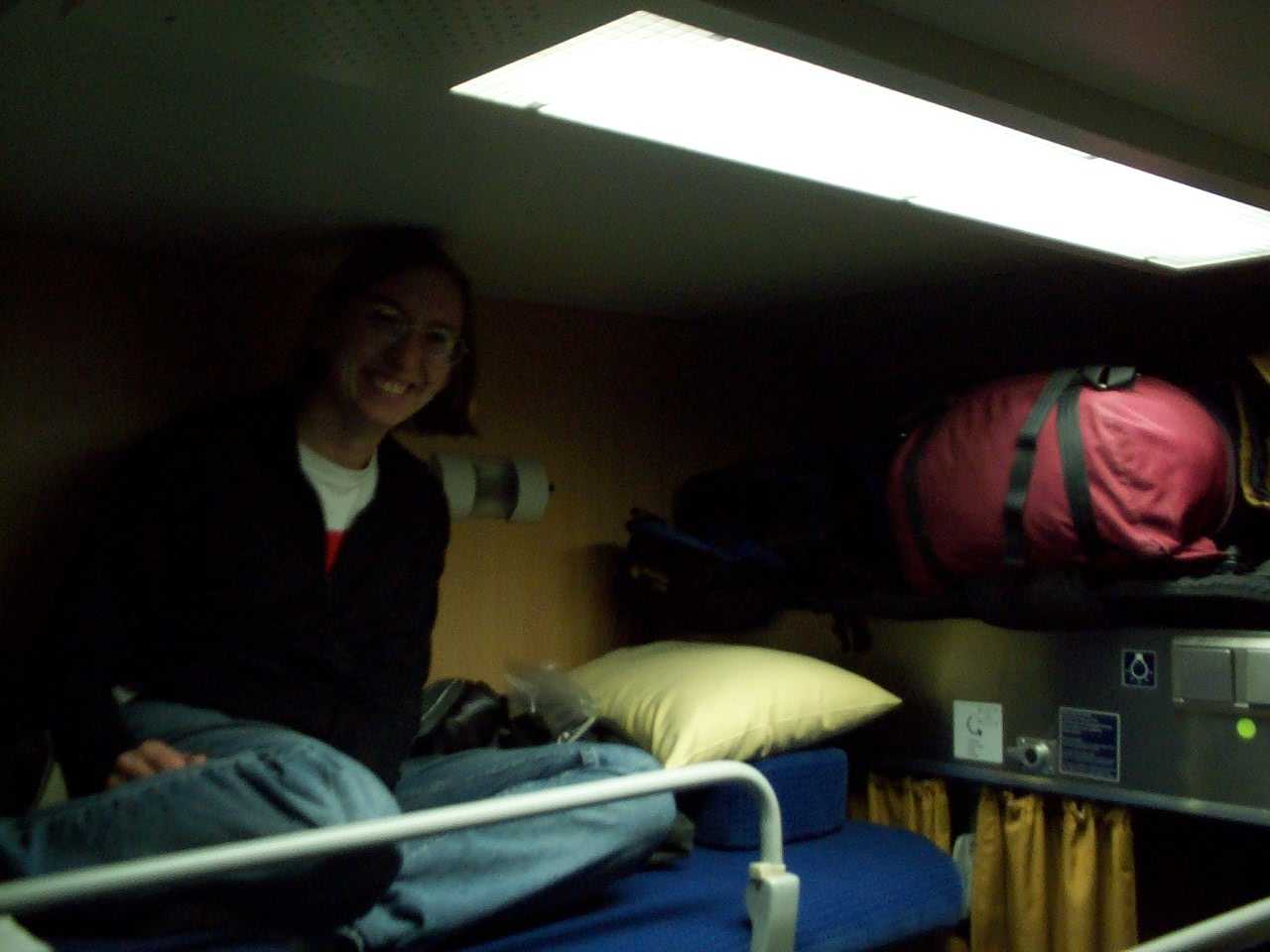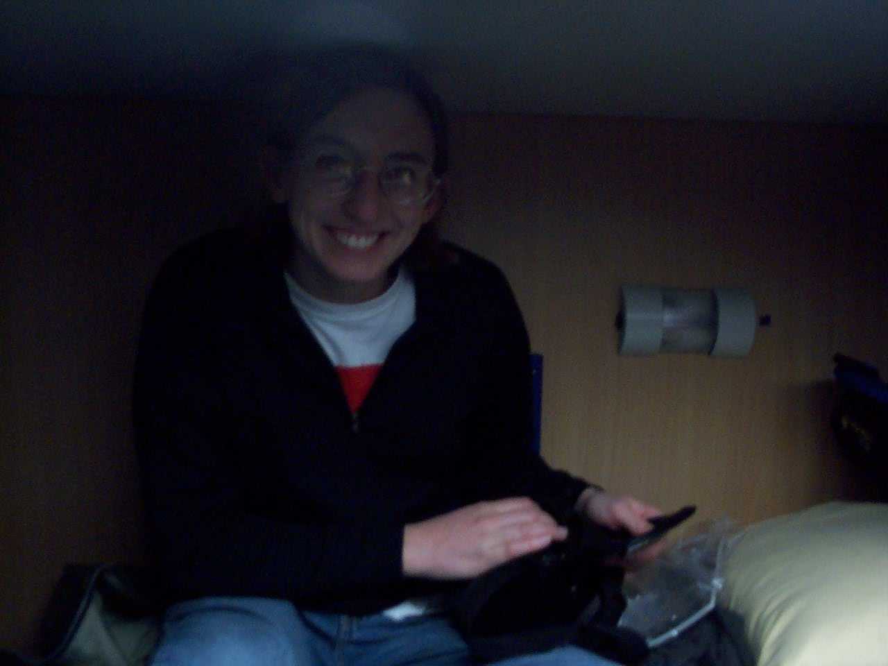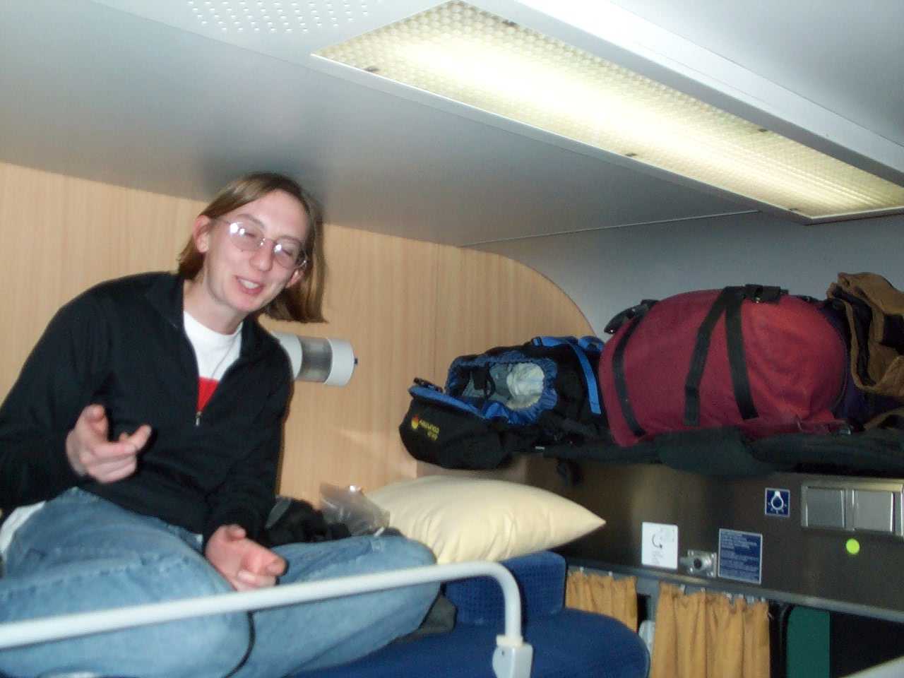 The train did arrive a little late, and we got on for the trip back to Ulm. I took the pictures below. Simone likes the second. The third is the best photograph except that I caught Simone blinking. The couchettes are comfortable, and I slept a few hours.