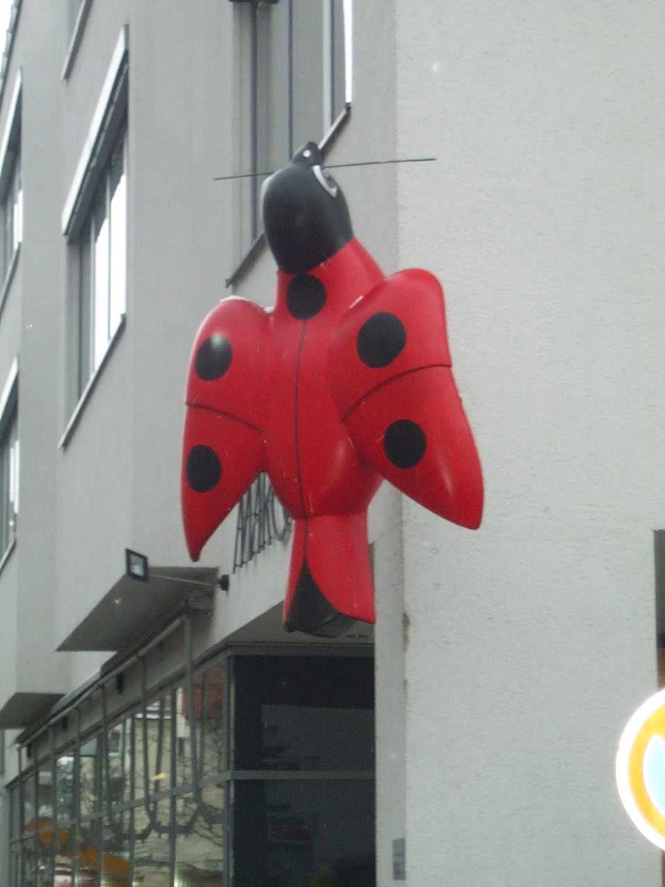 | Hummingbird Sparrow. I think it is a hummingbird sparrow because it is over a store named Kolibri. Is that some sort of flowerbud at its mouth? |