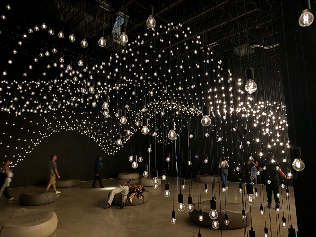 In the Pulse Topology work, your pulse is recorded and then played at one of the 3,000 light bulbs until it is overwritten by somebody else’s, 3,000 visitors later.