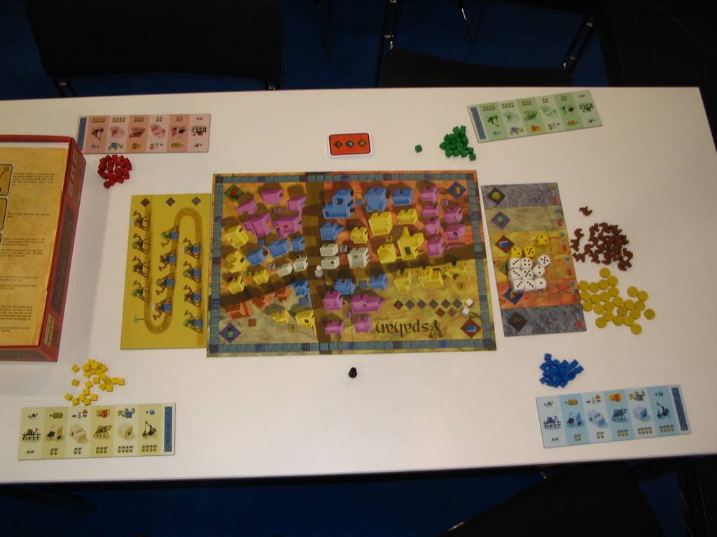 I did get back to the fair between the morning photographs at the Zollverein and the evening photograph of the sign, but I did not take any pictures for you. I played Der Dieb von Baghdad (The Thief of Baghdad). It is a light-medium weight game, and I might rate it about a six on the Board Game Geek scale. However, it was not clear to me whether there were good ways to block your opponents. If there were, that would add some strategy and make the game more interesting.