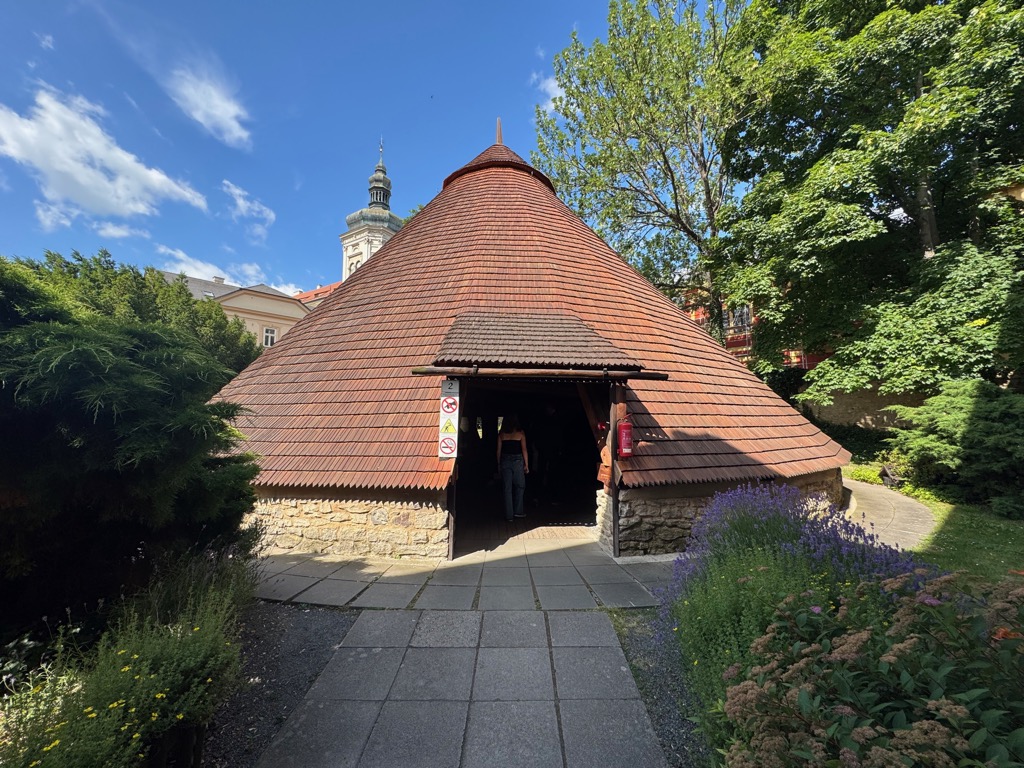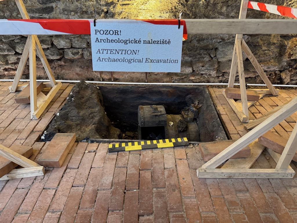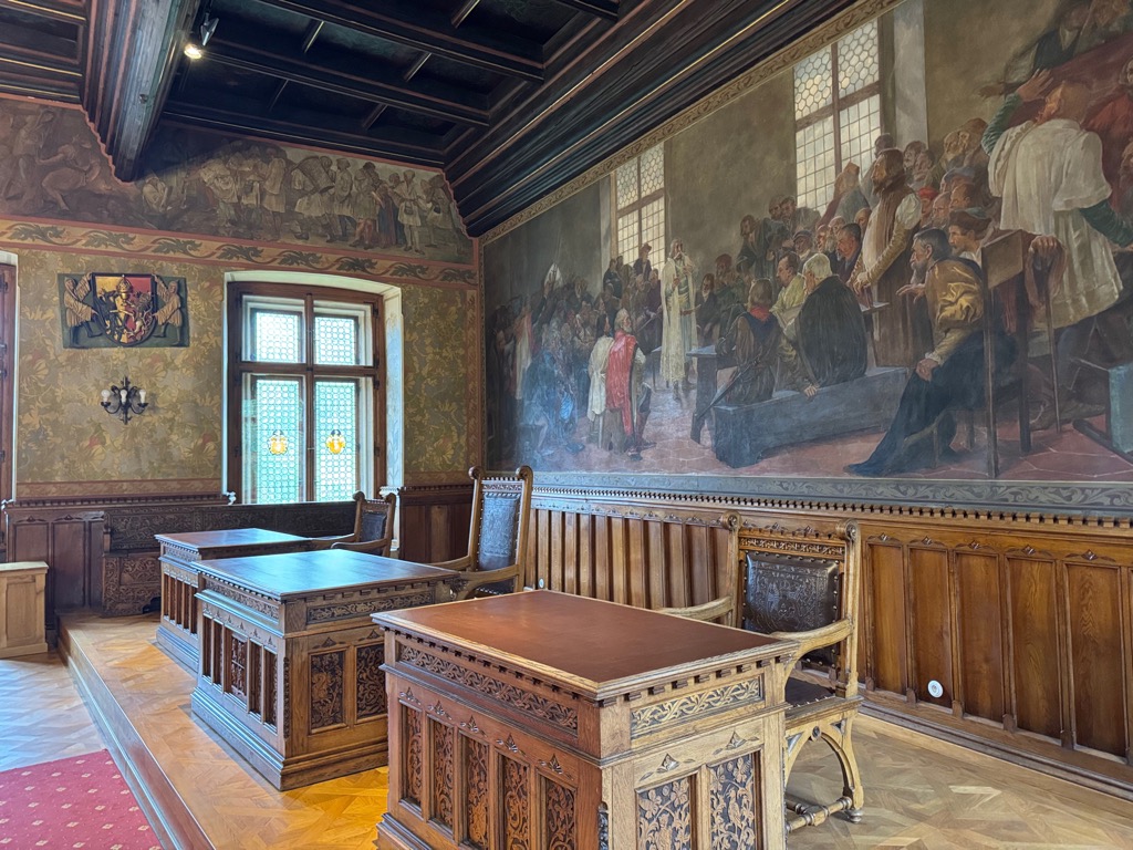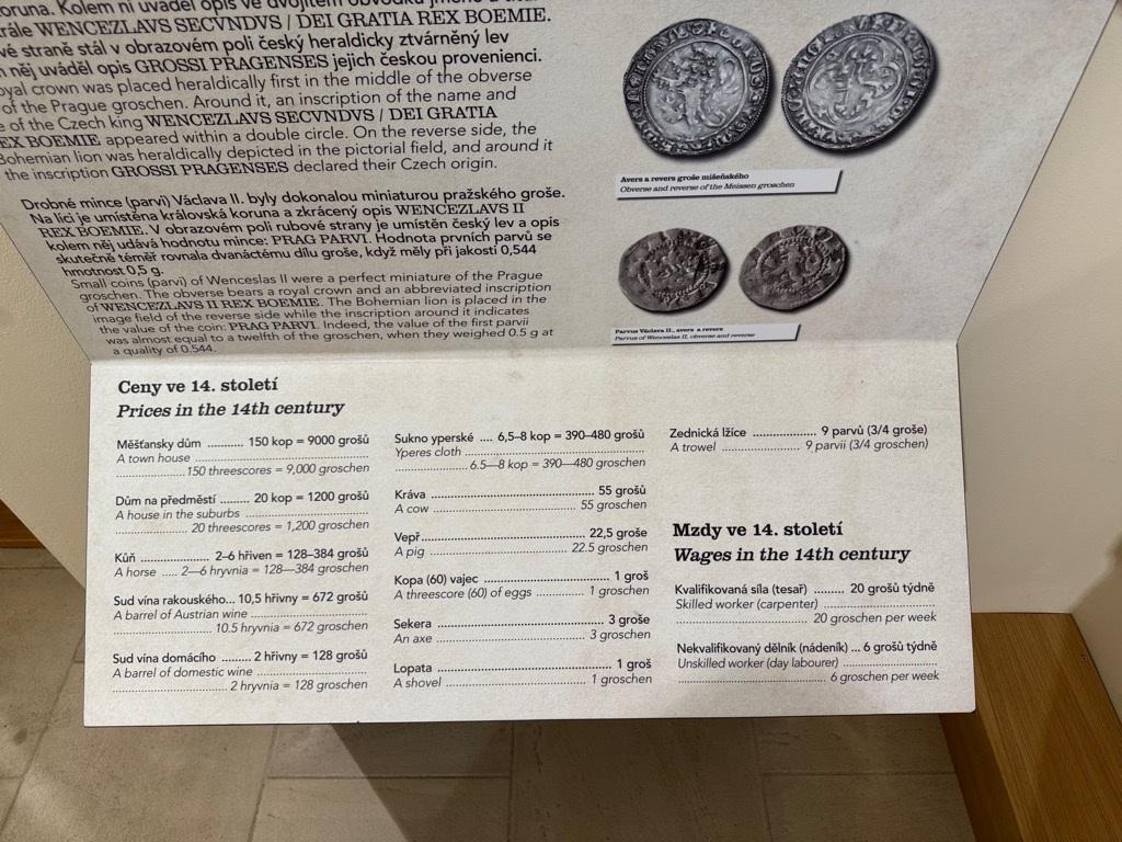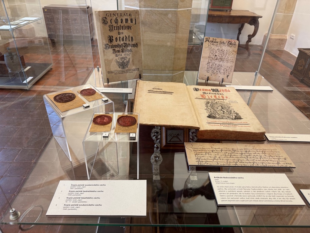 | Display at Kamenný dum (Stone House). Bottom left: Banner of the Millers’ Guild. Bottom right: Banner of the Butchers’ Guild. The latter matches the grocer’s guild in the game. |