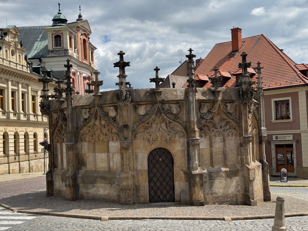 | Sign on Hrádek (little castle) with crests. That miner’s guild crest on the left matches one in the game. |