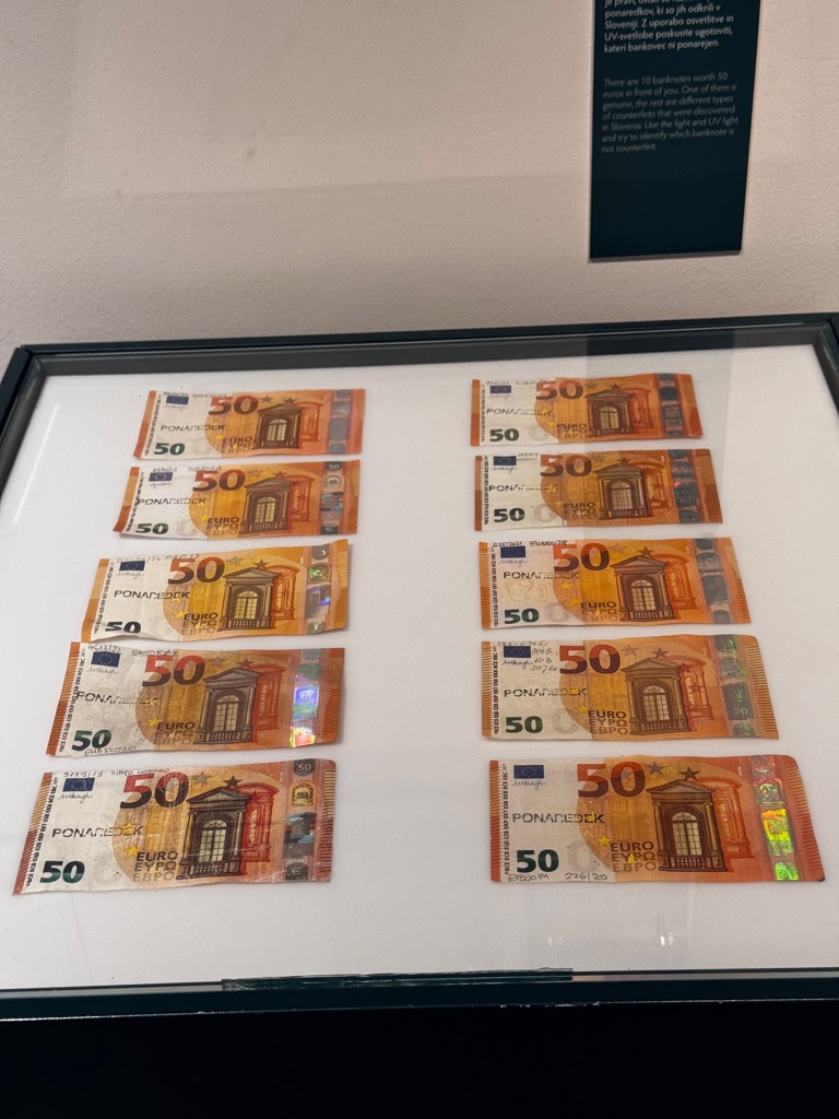 | Muza display: Ten €50 notes, nine counterfeit. |