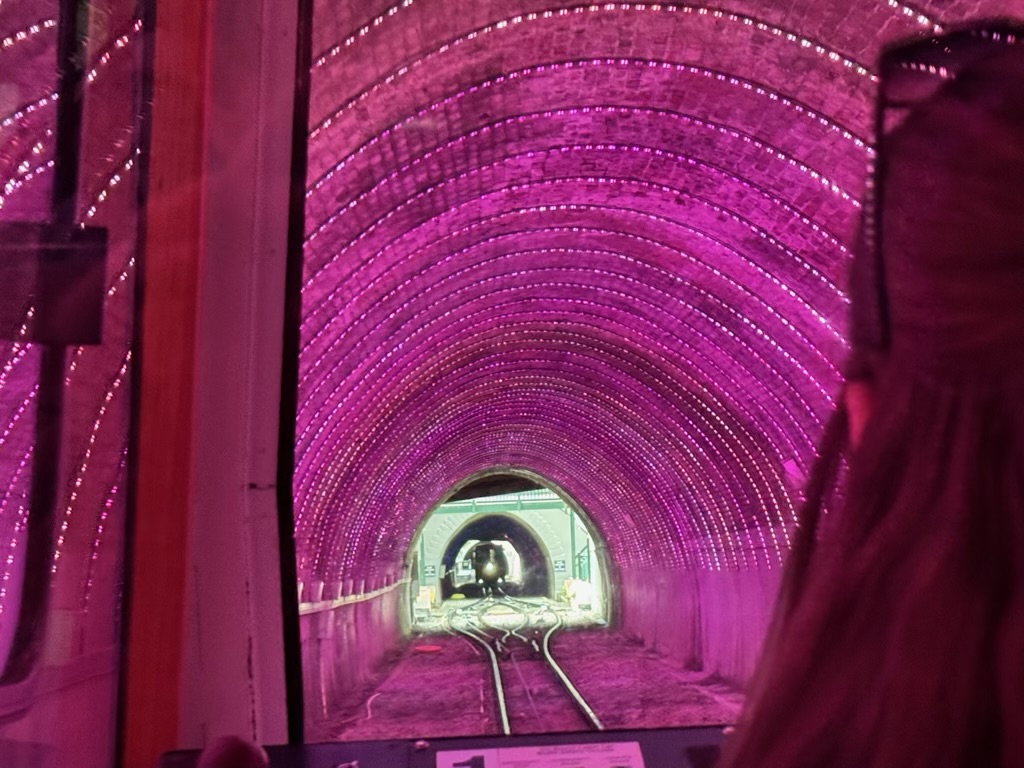 Purple lights in cable car tunnel