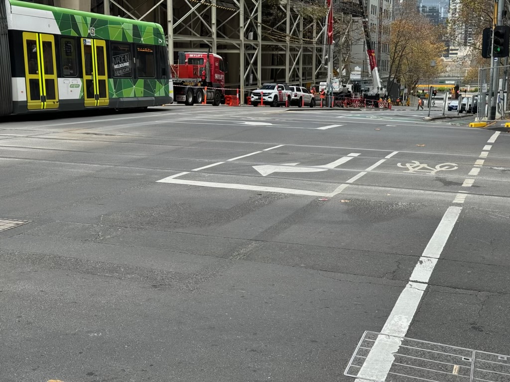 The second picture below shows a traffic oddity: a hook turn. Australian traffic drives on the left. A driver coming toward the camera and wanting to make a right turn pulls to the left their traffic stream and waits in that right-turn box. When the traffic signal turns green for the cross street, then they complete the right turn and go.